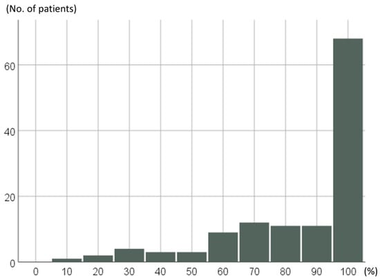 Distributions of relative dose intensity (RDI) separated by 10% in the 124 pazopanib-treated STS patients.