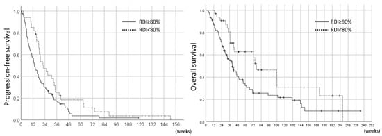 The PFS and OS of all 124 STS patients compared by RDI throughout the pazopanib treatment are shown in Figure 4. From a comparison of RDI throughout the treatment periods, patients with RDI ≥80% had significantly shorter PFS and OS compared to those with RDI <80% (median PFS was 13.6 weeks vs. 22.4 months, p = 0.027; median OS was 40.4 weeks vs. 77.0 weeks, p = 0.019).