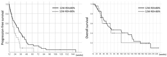 Adverse events observed in >10% of the 12W-RDI <80% patients were lymphocytopenia, anemia, thrombocytopenia, fatigue, increased total bilirubin, increased AST (aspartate transaminase)/ALT (alanine transaminase), increased serum creatinine, and electrolytes disorders. Anorexia, diarrhea, pneumothorax, and hypothyroidism were observed in >10% of the 12W-RDI ≥80% patients. Regarding adverse events of Grade 3 or more, increased AST/ALT was highly observed in the 12W-RDI <80% group (33%).