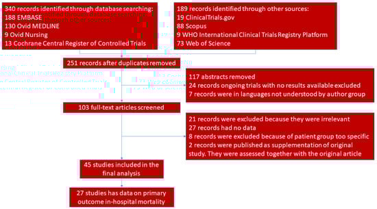 The database search identified 529 records. After duplicates were removed, 251 records were identified and screened by LL and RL. After 117 abstracts were excluded, 24 ongoing trials with no results available, and seven records in languages that our group could not read were also excluded (all seven of these papers appeared to be reviews or articles that contained no original data). The remaining 103 were discussed in a consensus meeting by CAG, MB, KH, LL, and RL. We included 45 papers in the final analysis [,,,,,,,,,,,,,,,,,,,,,,,,,,,,,,,,,,,,,,,,,,,,] (Figure 1). Excluded studies and the reasons for their exclusion are listed in Appendix G (Table A1).