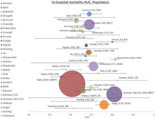 From the 27 studies with a total of 380,041 patients that had data on in-hospital mortality, the median AUROC was 0.68, with a range from 0.55 to 0.82 (Figure 2). A total of 24 studies had data on sensitivity and specificity, ranging from 0.16 to 0.98 (median 0.52) and 0.19 to 0.97 (median 0.81), respectively. Positive and negative predictive values were reported in 18 studies with a range of 0.10–0.38 (median 0.2) and 0.85–0.99 (median 0.95), respectively. Positive and negative likelihood ratios were available in 12 studies, ranging from 1.2 to 4 (median 1.83), and 0.24 to 0.84 (median 0.59), respectively.