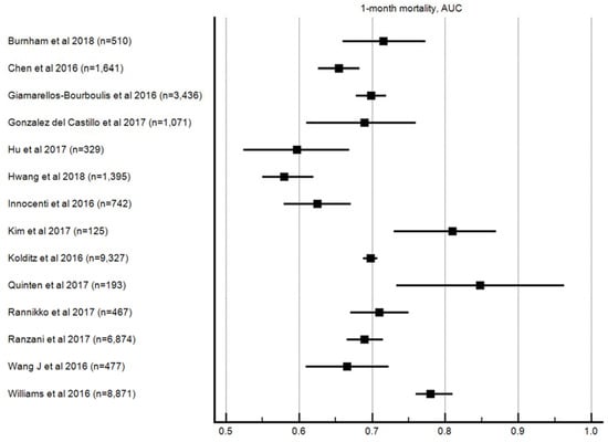 A total of 14 studies, with 35,775 patients reported 1-month mortality data (Figure 3). The median AUROC ranged from 0.58 to 0.85 (median 0.69). Sensitivity data were available in 12 of these studies, which ranged from 0.06 to 0.71 (median 0.43); specificity data were available in 13 studies, and ranged from 0.10 to 1.00 (median 0.84). PPV and NPV data were available in 10 studies, and they ranged from 0.14 to 0.68 (median 0.34) and 0.69 to 0.97 (median 0.91), respectively. Positive and negative likelihood ratio data were available in eight studies, and the values ranged from 1.99 to 4.66 (median 2.22) and 0.3 to 0.9 (median 6.43), respectively.