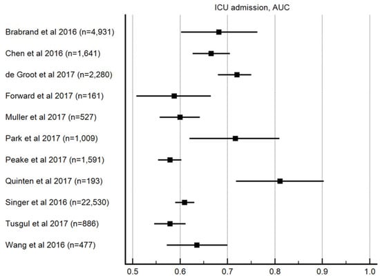 From the 12 studies that reported data on ICU admission, AUROC ranged from 0.58–0.81 (median 0.65, Figure 4. AUROC for ICU admission). Ten studies had data on sensitivity and specificity, which ranged from 0.1 to 0.74 (median 0.37) and 0.42 to 0.97 (median 0.86), respectively. The positive predictive value and negative predictive value data were 0.089–0.578 (median 0.38) in eight studies, and 0.19–0.99 (median 0.90) in nine studies, respectively. Positive and negative likelihood ratio data were available in eight studies, and ranged from 1.27 to 9.97 (median 2.68) and 0.5 to 0.9 (median 0.63), respectively.