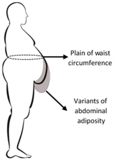 Direct evaluation of the amount of visceral and abdominal adiposity requires consuming and expensive imaging investigations (computed tomography, nuclear magnetic resonance etc.). This is the reason for searching indirect possibilities of measuring them. Currently, the most used parameter correlated with the amount of abdominal adiposity is waist circumference. WC measured according to WHO recommendations [11] in a plane which is parallel to the floor plane, at half the distance between the last rib and the iliac crest, at the end of expiration. The patient with empty stomach (à jeun), stays with close heels and relaxed abdominal muscles. This way to measure WC underestimates the relationship with abdominal obesity, the most part of adiposity being placed under the waist circle, due to different shapes of the “abdominal profile” (Figure 1).