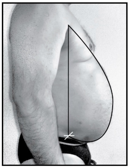 Thoracic-abdominal profile curve is obtained by acquiring the profile image with a digital camera of 6 megapixels (MP) (Sony Cyber Shot 6.0. MP camera, Sony Corporation, Japan, Tokio), fixed on a height adjustable tripod. Acquiring the thoracic-abdominal profile image of the patients was performed at 1m distance. The optic axis of the camera was focused at waist level for each subject (height of WC measurement), focalization was adjusted according to the patients’ anthropometric characteristics using the adjustable height of the tripod. Thus, the optical parallax errors were minimized and have not been calculated. Standard photos were obtained for each patient. The vector graphics program Adobe Illustrator (using Bézier curves) was used in order to overlap the obtained image and draw a vertical line starting from the anterior superior iliac spine (iliac spine is palpated and dotted with a marker on the patient skin—white “x”), to the anterior axillary fold from where a perfectly overlapped curve with the thoracic-abdominal profile descends and returns to the starting point (Figure 2).