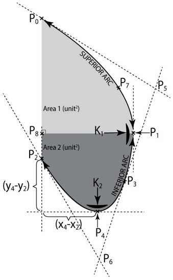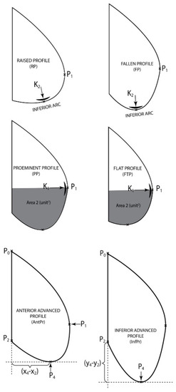 - The second classification has been made according to K1, in P1 and the area limited by the arc (P1P3P4P2) and the segments [P2P8] [P3P1], Area2, giving a clue on the size of the bottom part of the patient’s belly.The thoracic—abdominal profile curve is characterized by the fact that arcs (P7P1) and (P1P3), respectively are very far away from the vicinity of point P1, meaning that arc (P7P3) is almost the same with the segment [P7P3], that is the belly is straight at the front;The thoracic-abdominal profile curve is characterized by the fact that arcs (P7P1) and (P1P3), respectively are closer to the vicinity of point P1, meaning the belly is “pursed” towards the front part.
