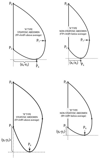 Similarly, the patients with “B type steatosic abdomen” were defined by the occurrence of a Fallen profile associated with Inferior advanced profile above average (FP + InfPr above average) and they were compared to the patients with “B type non-steatosic abdomen” who presented Raised profile associated with Inferior advanced profile below average (RP + InfPr below average) (Figure 5).