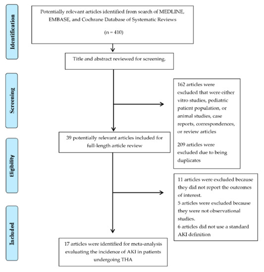 A total of 410 potentially eligible articles were identified using our search strategy. After the exclusion of 162 articles based on title and abstract for clearly not fulfilling inclusion criteria on the basis of type of article, study design, population or outcome of interest, and 209 due to being duplicates, 39 articles were left for full-length review. 11 of them were excluded from the full-length review as they did not report the outcome of interest while 5 articles were excluded because they were not observational studies. Six studies [9,10,11,12,13,14] were subsequently excluded because they did not use standard AKI definitions of Risk, Injury, Failure, Loss of kidney function, and End-stage kidney disease (RIFLE), Acute Kidney Injury Network (AKIN), and Kidney Disease: Improving Global Outcomes (KDIGO) classifications. Thus, 17 cohort studies [18,19,20,21,22,23,24,25,26,27,28,29,30,31,32,33,37] comprising 24,158 patients undergoing THA were included into the meta-analysis of associated AKI incidence. The literature retrieval, review, and selection process are demonstrated in Figure 1. The characteristics of the included studies are presented in Table 1.