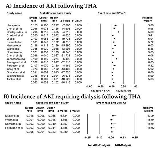 Forest plots of the included studies [18,19,20,21,22,23,24,25,26,27,28,29,30,31,32,33] assessing (A) incidence rates of AKI and (B) incidence rates of AKI requiring dialysis following THA. A diamond data marker represents the overall rate from each included study (square data marker) and 95% confidence interval (CI).