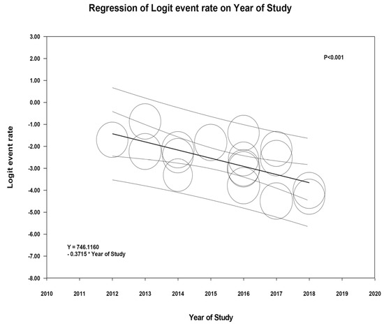 Meta-regression of all included studies showed significant negative correlation between incidence of AKI following THA and the study year (slope = −0.37, p <0.001), as shown in Figure 3.