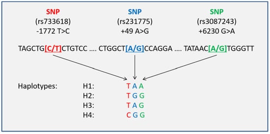 All patients were successfully genotyped, and the relevant haplotypes were inferred. The CTLA-4 rs733618 and rs3087243 genotype distributions were 4:90:550 (CC:CT:TT) and 142:305:197 (AA:AG:GG), with observed minor allele frequencies (MAFs) of 0.08 and 0.47, respectively. The observed frequencies were consistent with the Hardy–Weinberg equilibrium (χ2 test p = 0.8789 and p = 0.2448) and almost equaled the reported MAFs from reference populations, such as HapMap CEPH (CEU) with MAFs of 0.06 and 0.46 respectively (dbSNP database, accession numbers ss79540 [34] and ss44315036 [35]). The CTLA-4 haplotype analysis compound of the rs733618, rs231775, and rs3087243 SNPs revealed four common haplotypes (H1: TAA, H2: TGG, H3: TAG, and H4: CGG) (Figure 1).