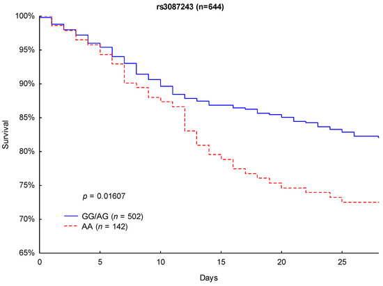 Although Kaplan–Meier analysis of 90- and 28-day survival revealed no significant differences between the CTLA-4 rs733618 TT homozygous and C allele carriers (p = 0.6864 and p = 0.4693), significant differences in survival were observed between the CTLA-4 rs3087243 G allele carriers and the AA-homozygous patients. CTLA-4 rs3087243 G allele carriers showed significantly lower 90-day mortality (27.3% vs. 40.8%, respectively; p = 0.0024; Figure 2) and 28-day mortality (17.9% vs. 27.5%; p = 0.0161; Figure 3) than AA homozygous patients.