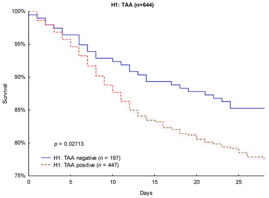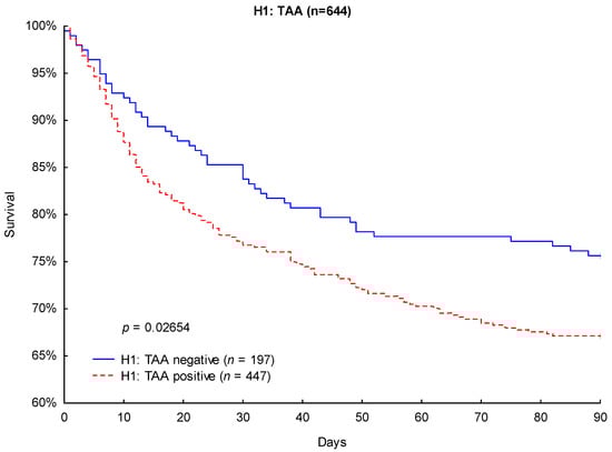 Likewise, Kaplan–Meier survival analysis revealed significantly lower 90-day mortality (24.4% vs. 32.9%; p = 0.0265; Figure 4) and 28-day mortality (14.7% vs. 22.4%; p = 0.0271; Figure 5) in TAA-negative patients compared to that of patients carrying the H1: TAA haplotype.