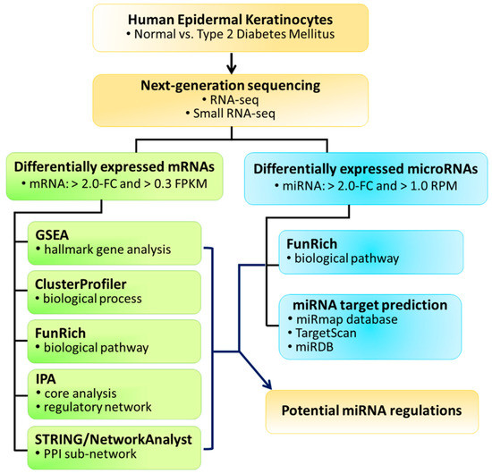 Study flowchart. Human epidermal keratinocytes of normal and type 2 diabetic skin were deep sequenced for RNA and small RNA expression profiles, and systematically analyzed using bioinformatics databases for deduction of novel molecular signatures in diabetic keratinocytes. FC, fold-change; FPKM, fragments per kilobase of transcript per million mapped reads; RPM, reads per million; PPI, protein-protein interaction; GSEA, gene set enrichment analysis; IPA, Ingenuity Pathway Analysis; STRING, Search Tool for the Retrieval of Interacting Genes/Proteins.