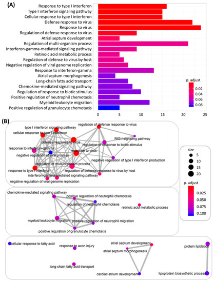 (A) Top 20 functionally enriched biological processes with corresponding adjusted p-values analyzed by clusterProfiler, which are displayed in a bar chart. The color scales indicated the different thresholds of adjusted p-values. (B) Interaction networks between enriched biological processes analyzed by enrichMap in the clusterProfiler package. The color scales indicated different thresholds of adjusted p-values, and the sizes of the dots represented the percentage of each term.