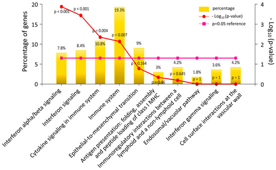 Enriched biological pathways of differentially expressed genes in diabetic keratinocytes. Top 10 biological pathways with their corresponding p-values and percentages of genes were obtained from enrichment analysis using the FunRich analytic tool, and are displayed in a bar chart. The significantly enriched biological pathways (p < 0.05) included interferon signaling and cytokine signaling in the immune system.