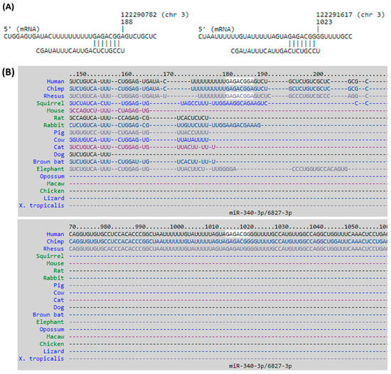 The putative binding sites of miR-340-3p on DTX3L. The sequences and putative 3′-untranslated region (UTR) binding sites of miR-340-3p on DTX3L at positions of 181–187 and 1016–1022 were validated in miRmap (A), TargetScan (B), and miRDB (C) databases.