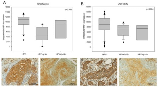 Intracellular migration inhibitory factor (MIF) expression in head and neck cancer patients. (A) Quantitative analysis of MIF expression in a series of 39 oropharyngeal cancer patients, including 21 Human Papilloma Virus negative (HPV-ve) cases and 18 HPV+ve cases (p = 0.001, Kruskal–Wallis test) and (B) 117 oral cavity cancer patients, including 65 HPV-ve cases and 52 HPV+ve cases (p = 0.004, Kruskal–Wallis test). (C,D) Immunohistochemistry of MIF in HPV-ve (C) and HPV+ve (D) oropharyngeal cancer cases and (E,F) in HPV-ve (E) and HPV+ve (F) oral cavity cancer cases.