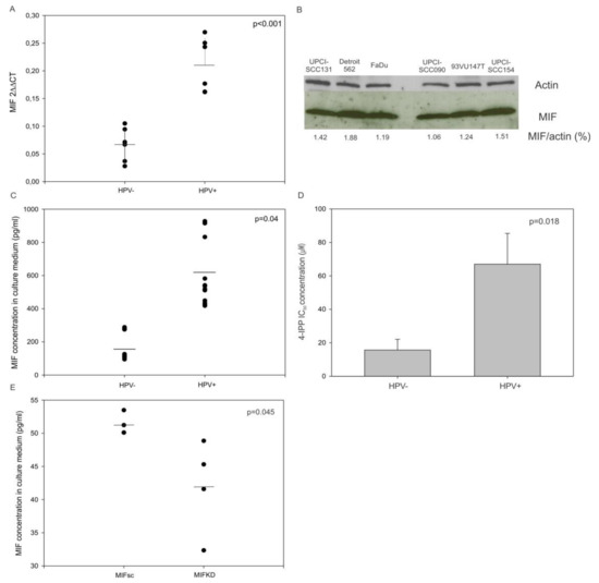 Finally, the use of 4-IPP, an inhibitor of MIF, in HPV-negative and HPV-positive HNSCC cell lines revealed that the concentrations required to achieve a 50% inhibition of cell proliferation were significantly higher in HPV-positive cell lines than in HPV-negative cell lines (Figure 2D, p = 0.018, Student’s t-test). This result agrees with the observations that MIF was more highly secreted by HPV-positive cell lines and that higher concentrations of 4-IPP were required to block this higher level of MIF, and consequently to inhibit cell proliferation.