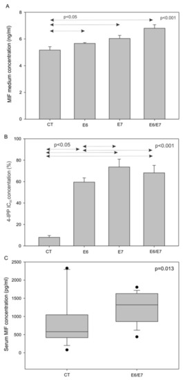 Macrophage migration inhibitory factor (MIF) secretion by murine cells in vitro and in vivo, and 4-IPP IC50 in murine cell lines. (A) Increase in the MIF concentration in the culture medium of SCCVII cells expressing HPV oncoproteins (p <0.001, one-way ANOVA). (B) Percentage of cell proliferation after exposure to 50 µM 4-iodo-6-phenylpyrimidine (4-IPP) in SCCVII CT, E6, E7 and E6/E7 cell lines (p <0.001, one-way ANOVA test). (C) Increase in the serum MIF levels of mice receiving SCCVII E6/E7 cells (n = 18), compared to the serum MIF levels of mice in the control group (CT) (n = 16) (p = 0.013, Mann–Whitney test).