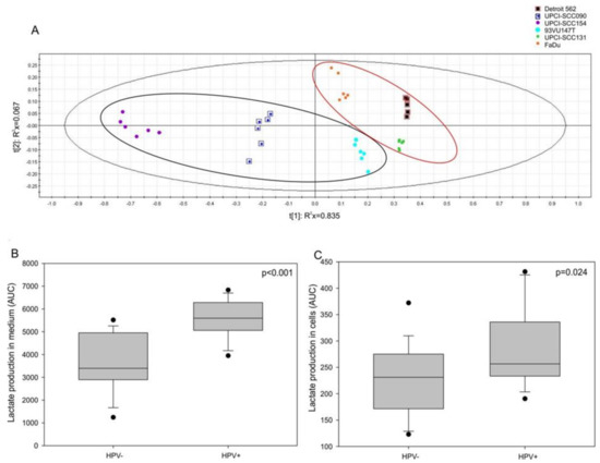 Lactate production in human cell lines. (A) Partial least-squares discriminant analysis (PLS-DA) for human papilloma virus (HPV)-positive and HPV-negative cell lines. Increase in lactate production in (B) the extracellular compartment (p <0.001, Mann-Whitney test) and in (C) the intracellular compartment (p = 0.024, Mann-Whitney test) of HPV-positive and HPV-negative cells.