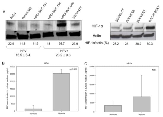 Hypoxia inducible factor 1α (HIF-1α) expression in human and murine cell lines. (A) Western blot analysis demonstrating the upregulation of HIF-1α in two human papilloma virus (HPV)-positive cell lines (UPCI-SCC-090 and 93VU147T) and in the murine SCCVII E6/E7 cell line. Concentration of macrophage migration inhibitory factor (MIF) in the culture medium of (B) human HPV-negative cell lines (p <0.001, Student’s t-test), and (C) in human positive cell lines (N.S., Student’s t-test) under normoxic and hypoxic conditions.