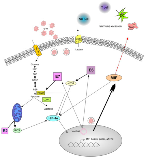 In conclusion, we have reported that MIF is more highly secreted in HPV-positive cells than in HPV-negative cell lines, probably by a specific still-unknown mechanism of MIF secretion, and that the E6 and E7 oncoproteins are implicated in this effect. Based on our data and literature, we explain this relationship by the fact that HPV oncoproteins interact with several pathways and metabolic processes, notably, the Warburg effect, thus generating MIF production. Figure 6 summarizes these pathways and our hypothesis. First, E6 activates mTOR, which leads to the accumulation of HIF-1α that induces the expression of several glycolytic enzymes such as PKM2, LDHA, and the lactate transporter MCT4; in addition, HIF-1α induces MIF expression [21,32,40]. Second, the E7 oncoprotein not only promotes the PKM2-mediated generation of lactate, but also induces HIF-1α expression, thus leading to MIF expression [24,26]. Therefore, the increase in MIF secretion as an immune system repressor, and the production of lactate through the Warburg effect, both by HPV oncoproteins, may lead to the development of a pro-tumoral microenvironment.