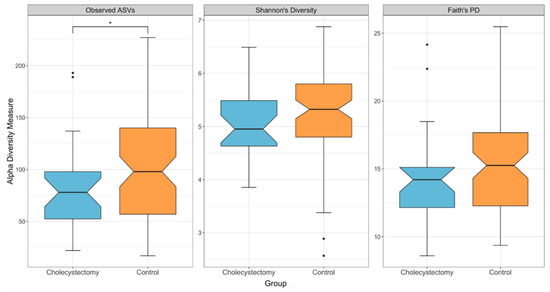 Boxplots of the alpha-diversity indices in the cholecystectomy and control groups. From left to right, observed amplicon sequence variants (ASVs), Shannon’s diversity index, and Faith’s phylogenetic diversity (cholecystectomy group, n = 27; control group, n = 81). * q < 0.05 (Kruskal–Wallis test, Benjamini–Hochberg correction).