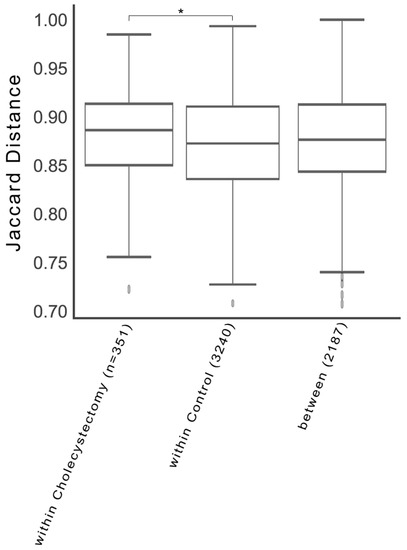 Beta-diversity indices of the cholecystectomy and control groups. From left, the Jaccard distances within the cholecystectomy group, within the control group, and between the cholecystectomy and control groups. * q = 0.027 (pseudo-F = 1.213, permutations = 999, PERMANOVA).