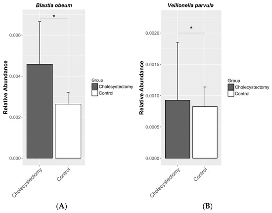 Relative abundances of (A) Blautia obeum and (B) Veillonella parvula in the gut microbiota. Both species were more abundant in the cholecystectomy group. * q < 0.05 (generalized linear models, Benjamini–Hochberg correction).