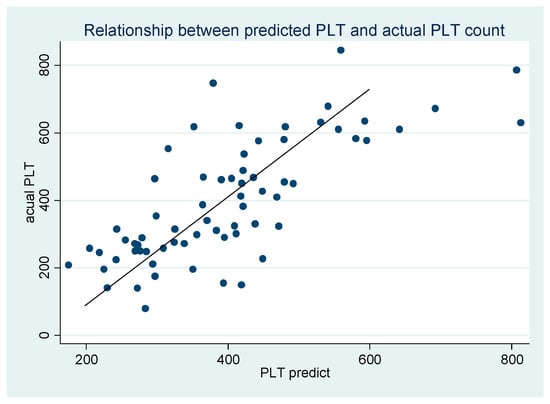 Predicted PLT was determined based on the regression equation. Its relationship with the actual PLT is presented in Figure 1, demonstrating a directly proportional correlation.