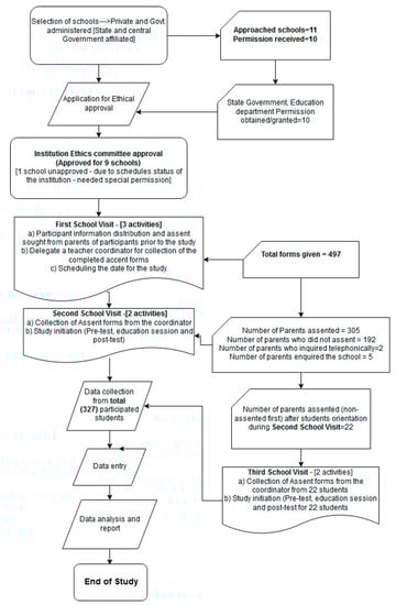 Eligible class VII students aged 11–13 years from public, private and charitable schools participated in the study after assenting from their parents (Figure 1). One school that acknowledged participating but was not permitted by the IEC (due to the scheduled status given by the government) was not included in the study. Parents who did not assent and those parents who assented but whose children were not present during the education session were excluded. During the assenting process, few queries based on the details provided in the “participant information sheet” were acknowledged telephonically. The queries were: one parent (a) enquired about the study, few parents enquired seeking specific information, such as (b) whether the study involved giving some injections to their children, (c) whether any medications would be given to their children, (d) whether they have to miss their classes to participate, and (e) if they have to travel outside the school for participating in the study.