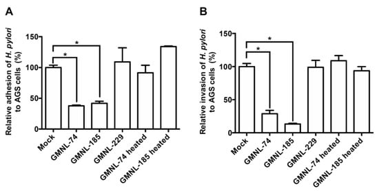 Adhesion of H. pylori to cells is an important initial step to induce pathogenesis in gastric epithelial cells [41]. We therefore investigated whether Lactobacillus inhibits the initial step of H. pylori adhesion and invasion of AGS cells. As shown in Figure 1A, both GMNL-74 and GMNL-185 exhibited significant anti-adhesion activity against H. pylori by 96.7% and 93.2%, respectively, as compared to H. pylori infection alone (mock group) (p < 0.01). In addition, GMNL-74 and GMNL-185 exhibited dramatic inhibitory activity against H. pylori invasion into AGS cells, with a reduction of 99.0% and 99.8% (Figure 1B). However, the control strain, GMNL-229, and heat-inactivated GMNL-74/185 did not exhibit the inhibition of H. pylori adhesion and invasion. These results demonstrate that GMNL-74 and GMNL-185 possess anti-adhesion and anti-invasion activities.