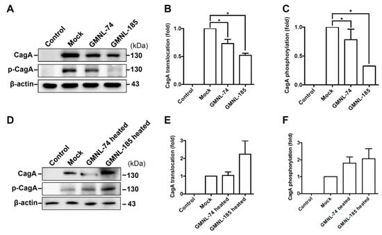 It has been demonstrated that CagA translocation and phosphorylation of H. pylori in gastric epithelial cells results in NF-κB activation and IL-8 production, indicating that CagA is crucial for inducing inflammation [8]. We therefore investigated whether Lactobacillus attenuated H. pylori CagA translocation and phosphorylation in AGS cells. As shown in Figure 3A, the expression levels of CagA translocation and phosphorylation increased remarkably in H. pylori-infected cells than those in uninfected cells (control group). However, the levels of translocated and phosphorylated CagA decreased significantly in cells treated GMNL-74 and GMNL-185 compared to cells infected with H. pylori alone (mock group). Furthermore, GLMN-74/GMNL-185 both possessed activities that reduced the H. pylori-induced cell scattering phenotype and decreased vacuolization in the cytoplasm (Figure S4). In contrast, the heat-inactivated GMNL-74/185 slightly increased CagA translocation and phosphorylation in AGS cells as compared to that infected with H. pylori alone (mock group) (Figure 3D). These results indicate that Lactobacillus attenuates CagA translocation and phosphorylation, leading to a reduction in the H. pylori-induced inflammation of gastric epithelial cells.