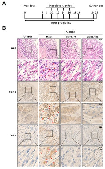 Probiotic Lactobacillus spp. alleviated gastric inflammation in mice. (A) Mice were fed with Lactobacillus spp. (GMNL-74 and GMNL-185) for 24 days followed by intragastric gavage with H. pylori 26695 once every 2 days for a total of six administrations. Arrows show the days of H. pylori inoculation. (B) Mice were euthanized and gastric tissues were subjected to hematoxylin–eosin (H&E) and immunohistochemical (IHC) staining with specific antibodies against cyclooxygenase-2 (COX-2) and tumor necrosis factor (TNF)-α, respectively (original magnification: 200×). The magnified images are shown in the lower panel of each cropped area. Severe infiltration of inflammatory cells in the gastric epithelium (H&E) and pronounced expression of COX-2 and TNF-α in gastric tissues are indicated by red arrows (IHC).