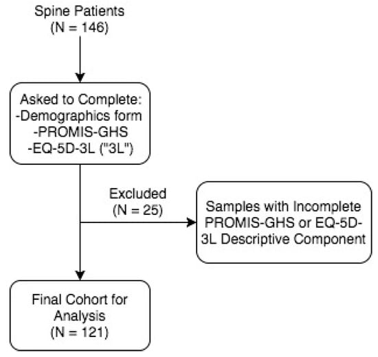This study was primarily conducted in the adult spine clinics of the three neurosurgeons (K.A., J.S.C, and L.K) at Yale University School of Medicine in New Haven, CT, with Institutional Review Board approval. Figure 1 illustrates the design of the study. In these clinics, 146 adult (>18 years of age) spine patients were recruited in 2017 as they entered the clinic with voluntary consent regardless of their clinical status (pre-operative, post-operative, or non-operative). Three forms were administered in paper to these patients: a demographics short form, PROMIS-GHS, and EQ-5D. PROMIS-GHS and EQ-5D were administered in random order. Completion of these two survey components was essential for obtaining an EQ-5D index and corresponding index estimates from PROMIS Global Health items. Out of 146 patients, complete survey responses were obtained from 121 patients.