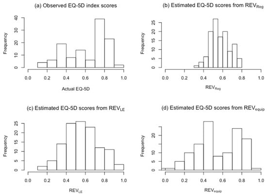 Histograms of observed EQ-5D index scores and estimates from REVReg, REVLE, and REVequip.