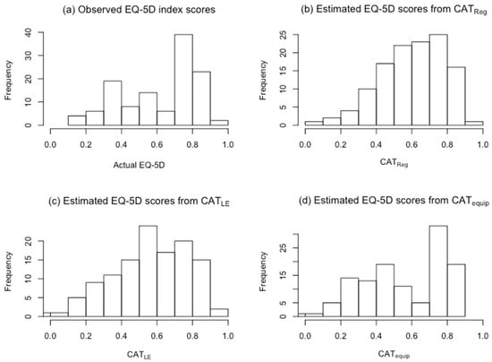 Histograms of observed EQ-5D index scores and estimates from CATReg, CATLE, and CATequip.