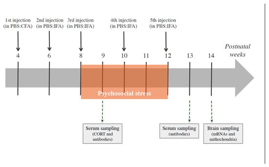 Timing of stress exposure and of the Group-A beta-haemolytic streptococcus (GAS) injections, expressed in weeks, and the experimental procedures performed. Mice (N = 9–10 per group) received 5 injections of GAS homogenate or Phosphate Buffer Saline (PBS), formulated with the indicated adjuvants (CFA = Complete Freund’s adjuvant; IFA = Incomplete Freund’s adjuvant). Serum samples were collected for antibody determination and corticosterone (CORT) concentration assessment; brain samples were collected for mRNA expression and mitochondrial analyses.