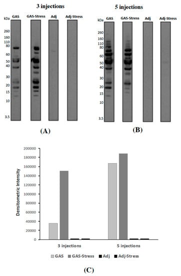 (A,B): Representative immunoblot of GAS extracts probed with pooled sera from mice either treated with 3 (A) or 5 doses (B) of GAS homogenate (GAS), GAS homogenate and psychosocial stress (GAS-Stress), adjuvant alone (Adj), or adjuvant and psychosocial stress (Adj-Stress). (C): Densitometric analysis of overall lane intensities from the blot shown in (A,B).