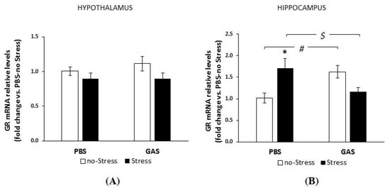 Conversely, hippocampal GR mRNAs levels were affected by GAS treatment and chronic stress condition (GAS by Stress interaction, F(1,18) = 17.607, p = 0.001, Figure 3B). Specifically, both chronic stress and GAS exposure independently increased GR concentrations compared to PBS no-Stress subjects. Yet, experimental subjects exposed to both treatments at the same time were indistinguishable from PBS no-Stress controls.