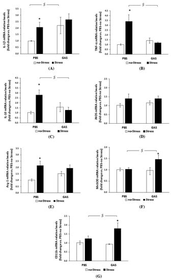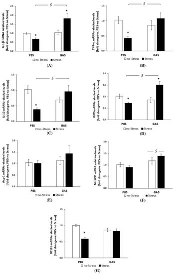 Unlike GAS per se, Stress alone significantly reduced IL-1β, TNF-α, IL-10, iNOS, and CD11b mRNA levels (Figure 5, panels A–D, and G respectively), as revealed by post hoc analyses (see the Figure legend).