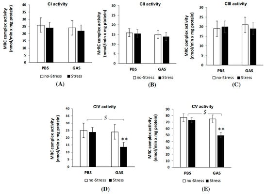 Mitochondrial respiratory chain (MRC) complex activities in brain of GAS-Stress mice and relative controls. The activities of the MRC (A) complex I, (B) complex II, (C) complex III, (D) complex IV and (E) complex V (ATP synthase) were measured spectrophotometrically in mitochondrial membrane enriched fractions from cryopreserved brain hemispheres of wt littermates control mice (PBS-no Stress), Group-A beta-haemolytic streptococcus exposed mice (GAS-no Stress), psychosocially stressed mice (PBS-Stress) and psychosocially stressed mice exposed to haemolytic streptococcus (GAS-Stress), at two weeks from treatment endings. Complex activities are expressed as nmol/min × mg protein. Data are mean rates ± SD obtained from three independent experiments. For MRC complex IV and V activities $ p < 0.05 for PBS-Stress vs. GAS-Stress; ** p < 0.01 for GAS no-Stress vs. GAS-Stress. Cohen’s d measures are reported in Table S1B.