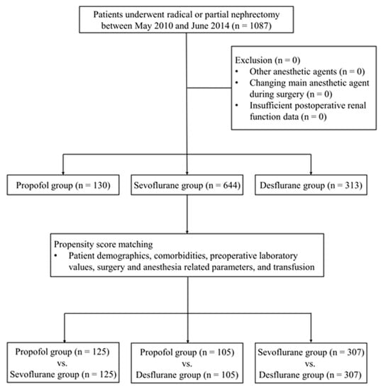 - Bang, J.Y.; Lee, J.; Oh, J.; Song, J.G.; Hwang, G.S. The Influence of Propofol and Sevoflurane on Acute Kidney Injury after Colorectal Surgery, A Retrospective Cohort Study. Anesth. Analg. 2016, 123, 363–370. [Google Scholar] [CrossRef]