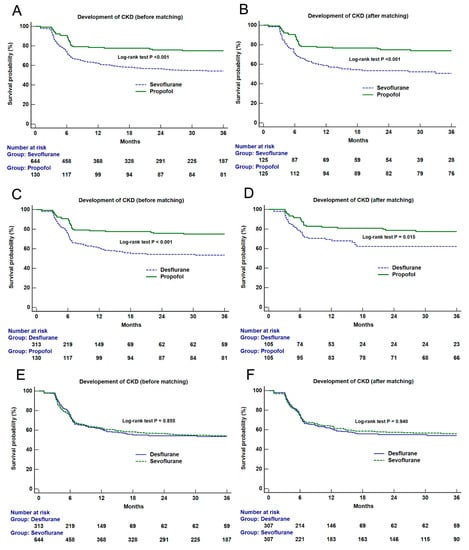 - Oh, T.K.; Kim, J.; Han, S.; Kim, K.; Jheon, S.; Ji, E. Effect of sevoflurane-based or propofol-based anaesthesia on the incidence of postoperative acute kidney injury, A retrospective propensity score-matched analysis. Eur. J. Anaesthesiol. 2019, 36, 649–655. [Google Scholar]