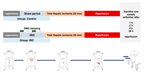 Study flowchart surgical protocol. Animals were randomized into two experimental groups (Control, RIC). Following laparotomy and dissection of the superior mesenteric artery (SMA) intestinal remote ischemic conditioning (iRIC) was applied as of 4-min of ischemia and 11-min of reperfusion via clamping of the SMA. Total hepatic ischemia was induced by clamping the hepatoduodenal ligament including both the portal vein and the hepatic artery. Animals were sacrificed after 1, 2, 6, 24 h of reperfusion for sample collection and further analysis (n = 5/group/time point). Modified from Emotzpohl, Czigany et al. Shock. 2018 []. Abbreviations used: iRIC—Intestinal remote ischemic conditioning; SMA—Superior mesenteric artery.