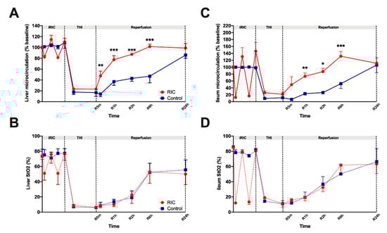 Tissue StO2 of the liver and ileum showed similar characteristic features, however, StO2 values did not follow the positive alterations of flow observed over the course of the reperfusion period in the RIC group (Figure 2). Accordingly, no significant differences were found between the two experimental groups, in terms of StO2 (Figure 2).