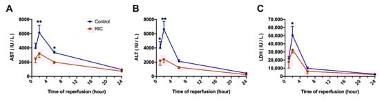 Markers of cellular injury. (A–C) Time course of transaminases and LDH demonstrated the peak of injury after 2-h of reperfusion. The application of iRIC significantly reduced transaminase and LDH release, especially during the acute phase of reperfusion (mean ± s.e.m., * p < 0.05, ** p < 0.01, RIC vs. Control, two-way ANOVA and Bonferroni post-hoc test, n = 5/group/time point). Abbreviations used: AST—Aspartate aminotransferase; ALT—Alanine aminotransferase; LDH—Lactate dehydrogenase; RIC—Remote ischemic conditioning.