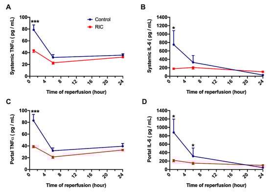 Portal and systemic levels of inflammatory cytokines. No major differences were found between the portal and systemic levels of proinflammatory serum cytokines (TNFα and IL-6). Systemic serum TNFα and IL-6 were significantly elevated in the early phase or reperfusion (1-h) (A,B). The application of iRIC resulted in a significant decrease of both inflammatory cytokines. Similar changes have been observed in TNFα and IL-6 levels of the portal blood (C,D) (mean ± s.e.m., * p < 0.05, *** p < 0.001 RIC vs. Control, two-way ANOVA and Bonferroni post-hoc test, n = 5/group/time point). Abbreviations used: IL-6—Interleukin 6; TNFα—Tumor necrosis factor alpha, RIC—Remote ischemic conditioning.