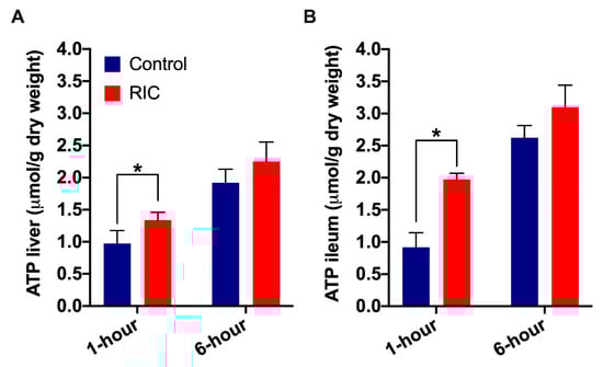 Similar characteristic features were observed concerning liver and intestinal tissue ATP levels in the RIC and Control groups (Figure 5). After a reduction of ATP levels following 1-h of reperfusion, a substantial recovery of the tissue energy reserves was observed after 3-h. However, the RIC group showed better preserved ATP levels throughout the experiments. There was a significant difference between the RIC and Control groups after 1-h of reperfusion (Liver: RIC1hour vs. Control1hour, 1.34 ± 0.12 vs. 0.97 ± 0.20 μmol/g dry weight, p = 0.04; Ileum: RIC1hour vs. Control1hour, 1.97 ± 0.10 vs. 0.92 ± 0.23 μmol/g dry weight, p = 0.02; Figure 5). Despite some graphical differences, no significant disparity was found between the RIC and Control groups after THI and 3-h of reperfusion (Figure 5).